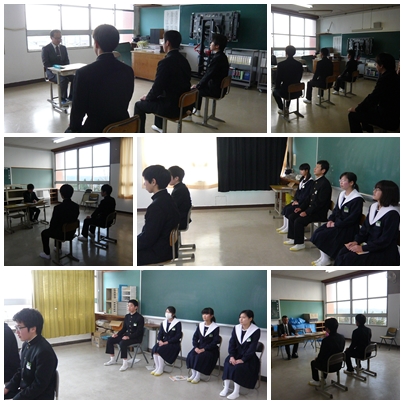 3年生面接練習(1月20日) 公開日 2017/01/20 更新日 2017/01/20 学校の様子 3年生は、6時間目面接練習を行っていました。いよいよ、入学試験や入社試験が近づいてきました。来週には、企業の方による面接練習も行います。 緊張をほぐすには、深呼吸と笑顔が有効です。昔から「笑う門には福来たる」といいます。笑顔をつくって心をリラックスさせると良い結果が得られます。がんばろう3年生!! いいね(0)