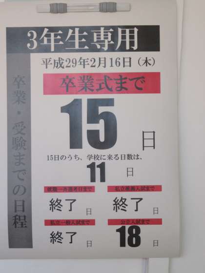 2月17日(金)の予定 公開日 2017/02/16 更新日 2017/02/16 連絡・お願い ● 1,2年生学年末テスト 1年 保体 社会 音楽 2年 数学 美術 社会 ● 3学年とも5時間授業 いよいよの学年末テスト最終日になります。有終の美を飾ってほしいと思います。 いいね(0)