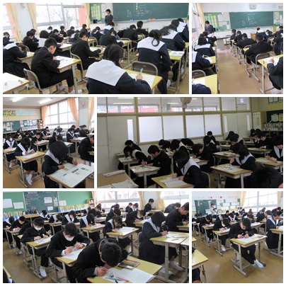 1・2年生学年末テスト3日目最終日になりました。2限には1年生が社会、2年生は美術に取り組んでいます。