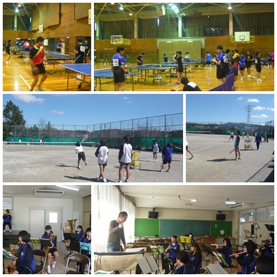 校舎内では、吹奏楽部が活動しています。バスケットボール部男子1年生は、尾張旭市の西中学校で1年生大会に参加しています。バスケットボール部男子2年生とバスケットボール部女子は体育館で練習を行いました。野球部は、練習試合に出かけていました。