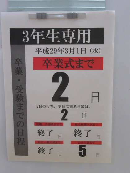 3月2日(木)の予定 公開日 2017/03/01 更新日 2017/03/01 連絡・お願い ● 50分日課 ● 簡単清掃 ● 卒業式予行練習 ● 式場準備 ■ ALT来校日 今日から卒業式の練習が始まりました。明日は予行練習と準備。そして明後日式当日です。 いいね(0)