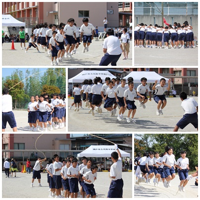 「せーの、1、2、3、・・・・」と学級全体で声を出し、3分間で何回飛べるかを競いました。「103回」を跳んだ学級がありました。たぶん新記録ではないかと思われます。