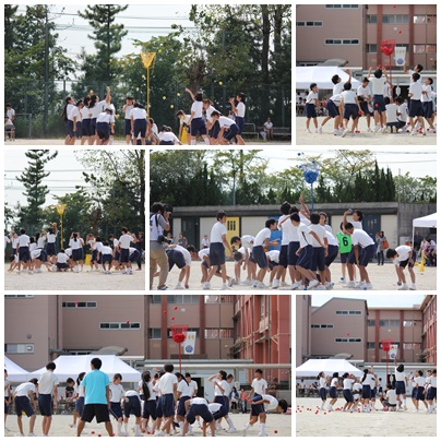 体育祭その11(9月14日) 公開日 2017/09/14 更新日 2017/09/14 学校の様子 「みんなでジャンプ」に続いて、2年生の学年種目「進めハリケーン」、そして3年生の「玉入れ」を行いました。 3年生の「玉入れ」は光陵中の伝統種目になってきました。小学校で経験した玉入れを義務教育最後の年に行います。中学生だけあって、用意した玉を1分足らずの間にすべて入れてしまい、急遽、時間を短くするというルール変更がありました。 いいね(0)