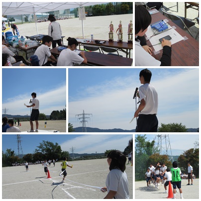 種目に出場した選手の皆さんが精一杯頑張ったことはもちろんですが、その裏では、放送を流したり、審判をしたり、ゴールテープを用意したり、アナウンスをしたりするなど様々なところでも、生徒たちが活躍していました。