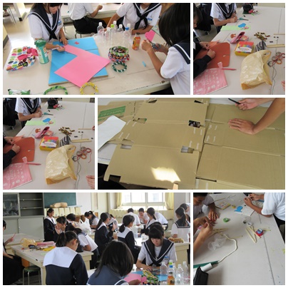 3年生家庭科の授業から(10月4日) 公開日 2017/10/04 更新日 2017/10/04 学校の様子 3年生の家庭科の時間では、保育実習を行っています。団地内の保育園に出かけ、自分たちが作成したおもちゃで、園児とのふれあいをします。 現在、家庭科の時間には、おもちゃづくりをしています。ペットボトルをピンにしたボウリングや、割り箸を釣り竿にした魚釣りなど、様々なおもちゃをつくっていました。 いいね(0)