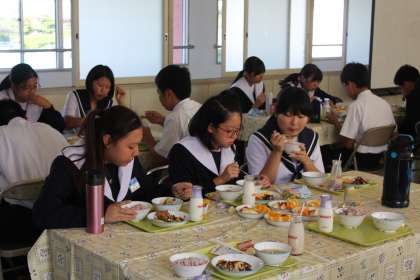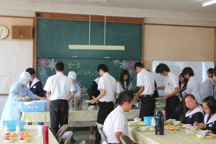 本日は,3年3組のバイキング給食の日でした。栄養教諭の先生から「日頃からできるだけ好き嫌いをせず,肉・魚・野菜などのメニューをバランスよく取って食べるように心がけましょう!」というお話を聞き,マナーを守って順番に並びながら配膳を行いました。中学校生活で一度きりのバイキング給食の味は,いつも以上に美味しく感じたことでしょう。