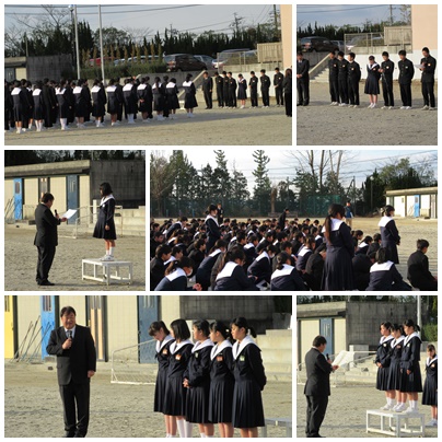 校長講話は、校内に落ちていた金柑の枕の話から始まり、3年生の私立高校・専修学校推薦入試が行われた話、2年生を中心とした部活動の大会での活躍の話、1年生の職業講座で講師の先生が話された話などがありました。