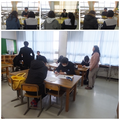 今回の三者懇談会は、主に公立受検校の決定についての懇談になります。懇談後、進路指導室で公立願書の清書を行っています。
