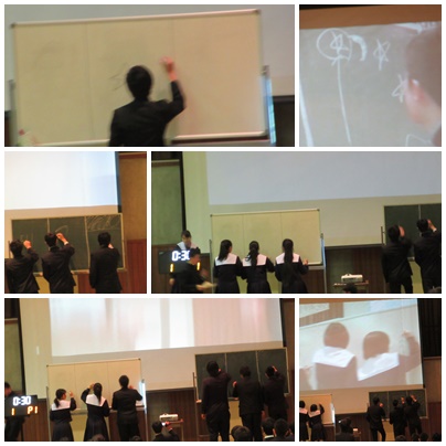 生徒会のクイズは2つありました。紙粘土に続いてのクイズは、クラスの生徒がお題に合わせて制限時間30秒で絵をかき、担任が何についてかかれたものかをあてるというものです。「夏休み」「せとものまつり」などのお題が出され、苦労して表現していました。