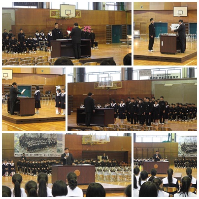 3年生皆勤賞表彰式(3月5日) 公開日 2018/03/05 更新日 2018/03/05 学校の様子 予行練習の前に、3年生の皆勤賞の表彰式を行いました。 最初に1年間皆勤の生徒45名を表彰しました。続いて、3年間皆勤だった21名の表彰を行いました。卒業生101名の内半分近い生徒が1年間の皆勤、5分の1の生徒が3年間皆勤だったことになります。 いいね(0)