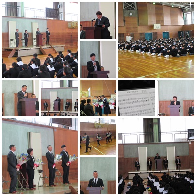 離任式(4月12日) 公開日 2018/04/12 更新日 2018/04/12 学校の様子 本日、午後離任式を行いました。校長が転出をした教職員4名の紹介があり、一人一人から最後の挨拶がありました。その後、代表生徒から一言、御礼の言葉を添えて花束が贈呈されました。最後に、新1年生も歌詞カードを見ながらですが、校歌を斉唱しました。 いいね(0)