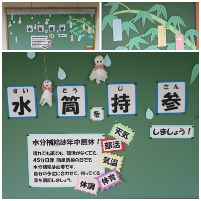 保健室前の掲示物(7月4日) 公開日 2018/07/04 更新日 2018/07/04 学校の様子 このところ蒸し暑い日が続いています。教室内にいるだけで汗ばみ、運動をしなくても水分が奪われてしまいます。 水筒を持参して放課などにこまめに水分補給がして熱中症にならないようにしたいと思います。ご家庭での準備をお願いいたします。 いいね(0)