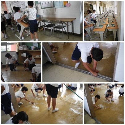 大掃除・ワックスがけ(7月17日) 公開日 2018/07/17 更新日 2018/07/17 学校の様子 本日6時間目は、全学年教室の大掃除とワックスがけを行っています。教室の机をすべて廊下に出して、ほうきでゴミをはいたの後、たわしと洗剤をつかって床を磨きます。 その後、美化委員がワックスがけをします。 いいね(0)