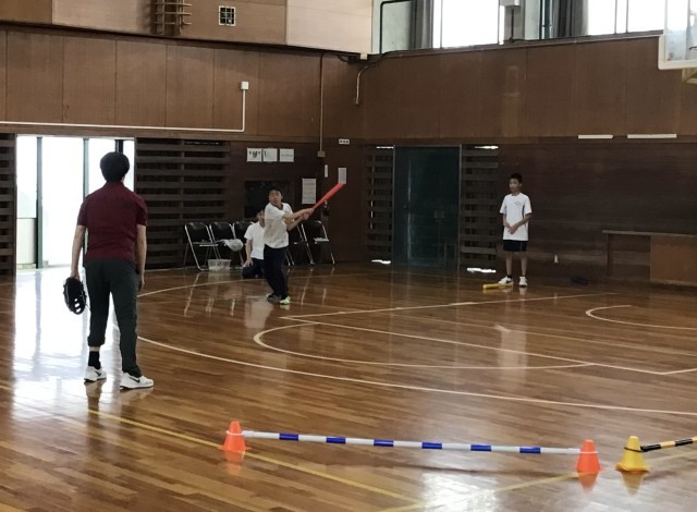 4限目、体育館で体育の授業があり、A組生徒と担当教員による「ベースボール型ゲーム」対決がおこなわれました。ピッチャーが投げるボールをヒットゾーンへ打ち返すには技術が必要ですが、上手にバットをあやつる生徒もいて、白熱の好ゲームが展開されていました!