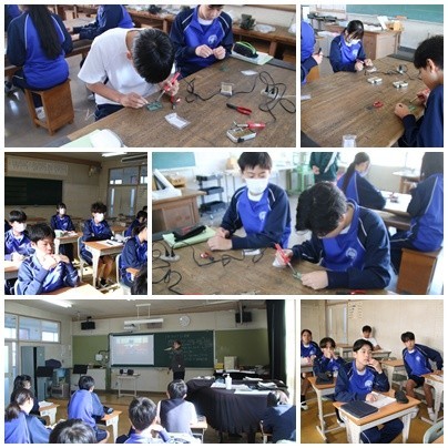 今日の授業の様子です。1年生は、英語と数学、2年生は技術でハンダゴテと音楽、3年生は社会と理科に取り組んでいます。