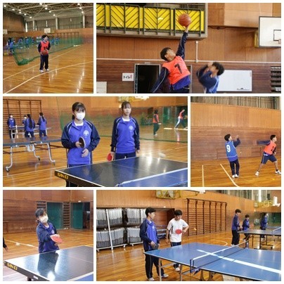 今日の授業の様子です。1年生は英語と道徳、2年生は体育でバスケットボールと卓球、3年生は数学と理科に取り組んでいます。