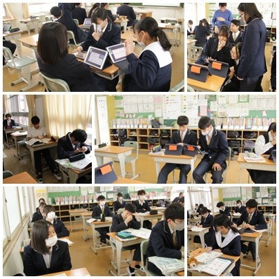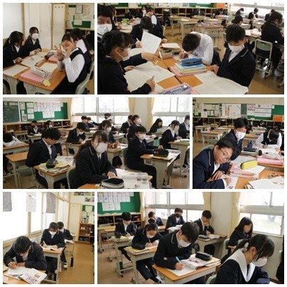 今日の授業の様子です。1年生は国語と社会、2年生は英語と理科、3年生は卒業式の練習に取り組んでいました。