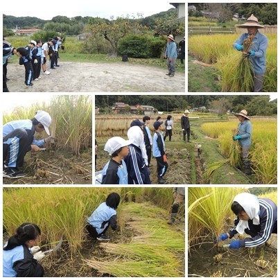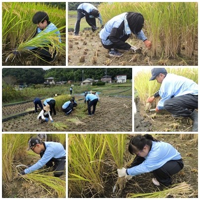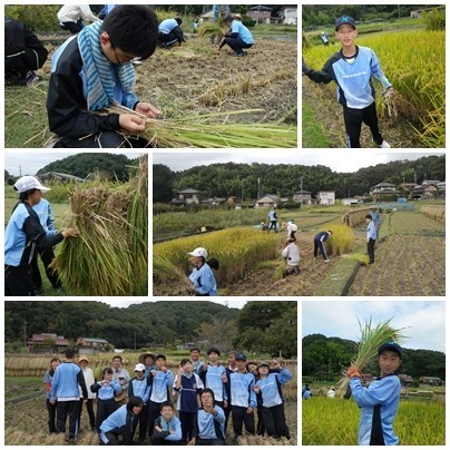 実りの秋を迎え、A組の生徒たちは、5月に本校PTAOBの方の田んぼをお借りして植えた稲を刈りとりました。田植えをしてから今日までの期間、草刈りや水の管理などを行っていただいたことで、苗はしっかりと根を張り、稲穂がたれさがるまでに成育していました。育った稲を刈り取る生徒たちの表情は、充実した笑顔にあふれていました。昨年度の経験を活かして、刈り取った稲を縛り、はさがけまで手際よく行いました。今後、稲は精米をして餅つきをしたり、もち米として販売したりする予定です。普段の学校生活や家庭では、なかなかできない貴重な体験ができたことに感謝いたします。ありがとうございました。