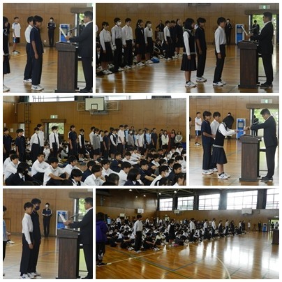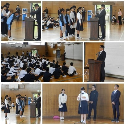 本日の全校集会では、学級委員・生徒会議員・委員長の認証が行われました。今年度も残り5か月となり、学級や学年、学校内の多くの場面で、新たなメンバーでの活躍を期待しています。そして、伝達表彰では、ソフトテニス部男子・書道・ポスター・読書感想文などの入賞者が表彰されました。