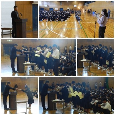 本日の全校集会は、はじめに「9・10月善行賞」「卓球部団体戦」などの伝達表彰が行われました。その後、校長講話では、地域の方からいただいた電話で、本校の生徒たちの思いやりのある行動に感謝を伝えたいという話から、地域とそこに住む人々を大切にする心、さらには、学校生活をともに過ごす仲間への思いやりの言動について話がありました。