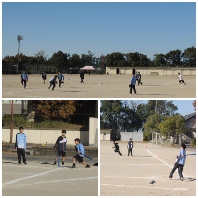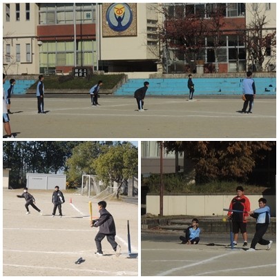 小春日和の穏やかな日、楽しそうな声が運動場から校舎まで届いてきました。1年生の体育では、ソフトボールをクラスの仲間と協力しながら進めていました。
