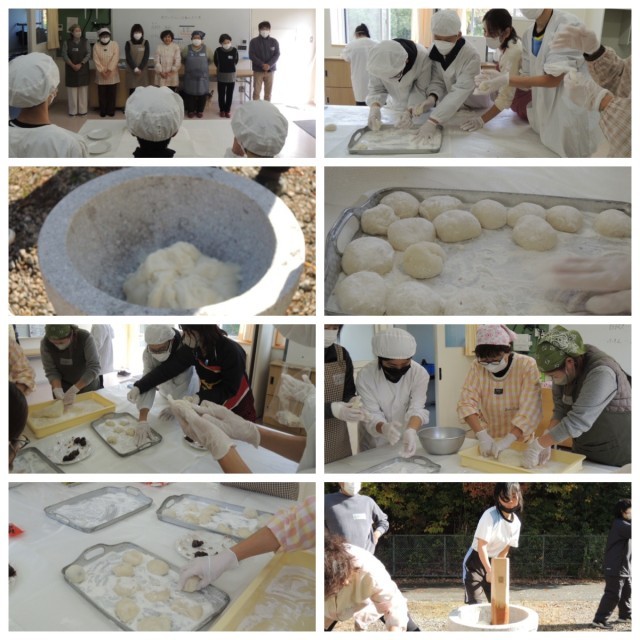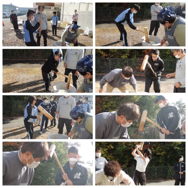 今年度、A組では春から田植えを体験し、秋には実った稲を刈り取るなど、農業体験をしてきました。本日は、地域の方々のお力をお借りして、そのもち米を使ってもちつきを実施しました。火のついたかまどで蒸した米をうすに移して、順番に生徒たちがもちつきを体験しました。放課には先生たちも応援に来て、一緒にもちつきを行いました。つきたての餅を食べた生徒たちは、柔らかく温かな食感に大満足のようでした。