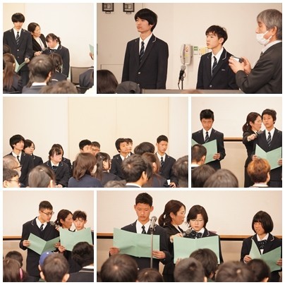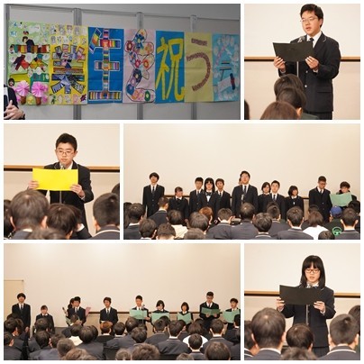 本日、A組は瀬戸蔵で行われる「卒業生を祝う会」に参加しました。卒業までひと月ほどとなった3年生を祝い、1・2年生が司会進行を行いながら、思い出をスライドや作文で発表しました。修学旅行や体育祭、文化祭などの楽しかった3年間の出来事や思い出が述べられました。また、これまでに交流してきた市内の友達やお世話になった先生への感謝の気持ちも伝えられ、とてもすてきな会となりました。