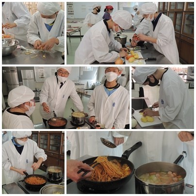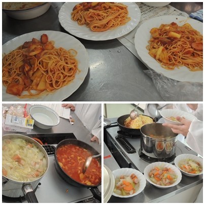 中庭を通るといいにおいがしてきました。調理室をのぞくと、A組の生徒たちが「ほくほくじゃがいものトマトパスタ、野菜とウインナーのスープ」づくりに取り組んでいました。野菜の皮をむき、包丁で切り、それぞれの具材を調理して、とても上手にできあがりました。生徒たちはおいしくいただいていました。