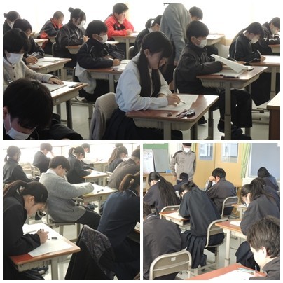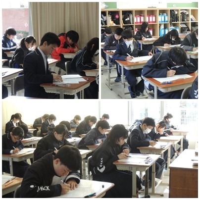 本日、1・2年生は、第4回テスト最終日となりました。教室に差し込む日差しにも暖かさを感じます。生徒たちは真剣な表情で、最後まであきらめずに問題に向かっています。