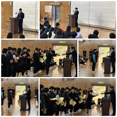 式後には、伝達表彰が行われました。また、生徒指導担当からは、冬休み中のお金の管理と使い方やSNSの利用の仕方について、十分に注意をして生活するように話がありました。交通安全担当からは、自転車運転中に注意することや、夜間の外出など、気をつけることについて話がありました。