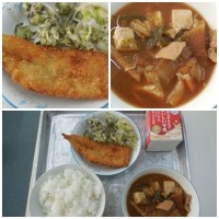 本日の給食は「みそおでん、魚のそぼろ、きゅうりとたくあんのあえもの、麦ごはん、...